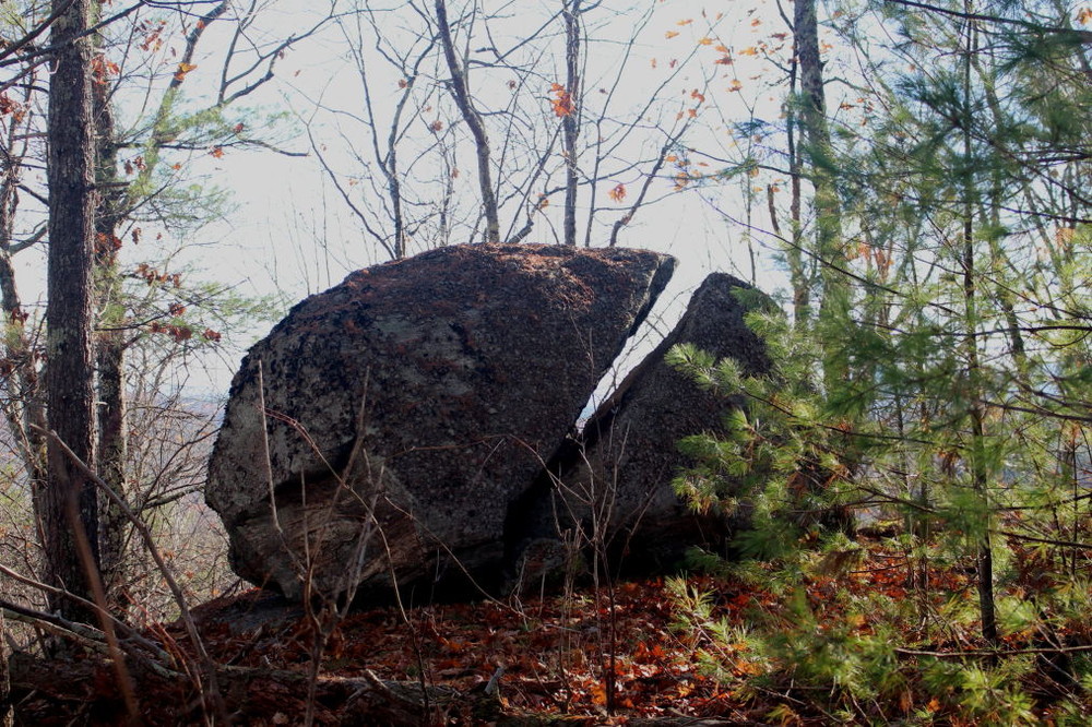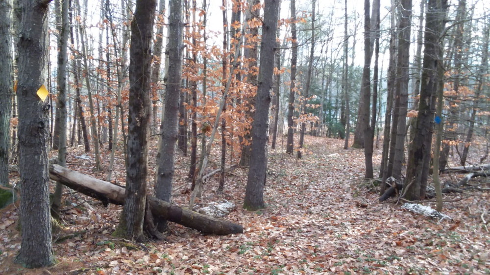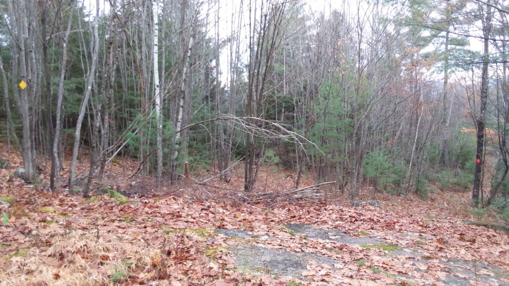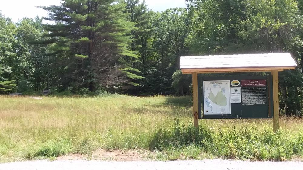 The Fogg Hill Trail is a moderate 2.0 mile round-trip trail with an elevation gain of 370' that passes by an active beaver pond where beaver, woodpeckers, and other wildlife may be seen. Beyond the pond the trail climbs at moderate grades to the wooded, 990' summit of Fogg Hill which is marked by a split granite boulder. In winter when the leaves are off the trees there are limited views of the Belknap Range to the south. Signs of moose are seen in many places along the trail where they have scraped bark from the trees beside the trail. The Fogg Hill Trail is blazed in yellow.