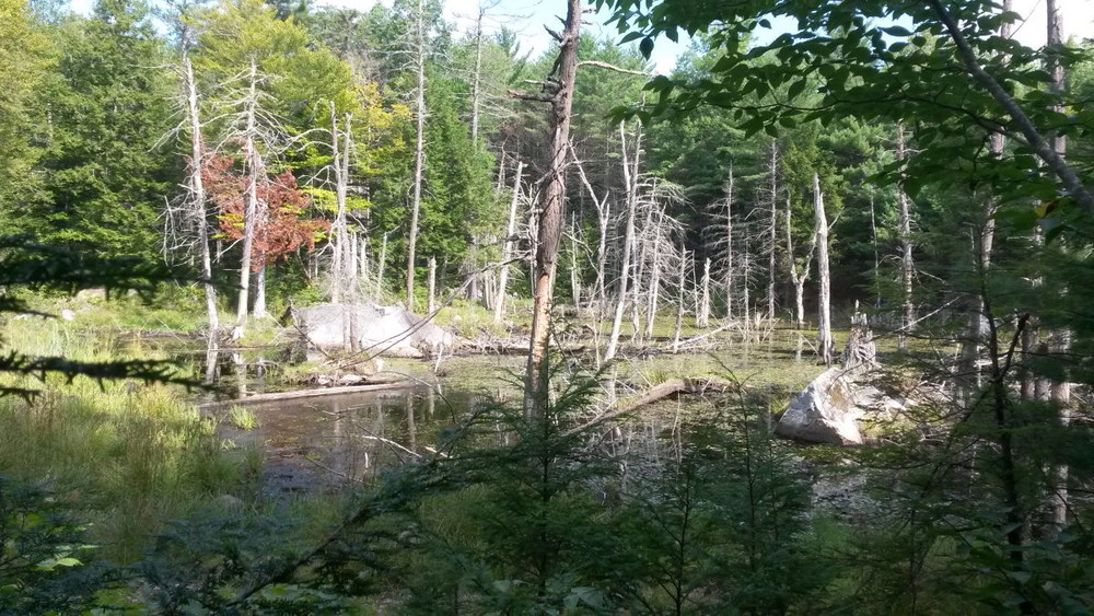 The Bog Trail, which terminates at private property, is a moderate 1.2 mile round-trip trail with some short, steep sections. It departs from the Fogg Hill Trail 0.9 miles from the parking area and is blazed in orange.