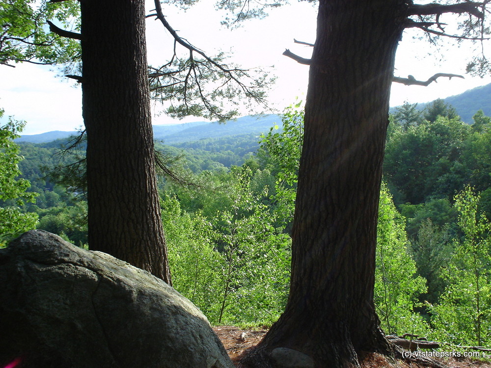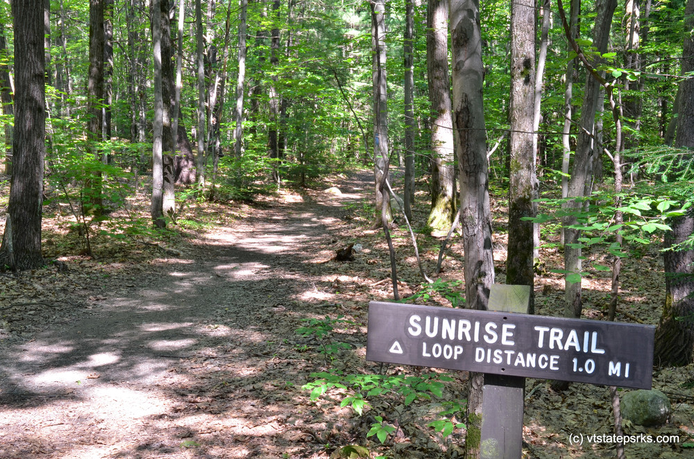 Sunset Trail: The Sunset trail is a half-mile loop trail on the western side of the park, starting near the entrance and looping through the play field. The trail has a western vista of the village of Algiers in the town of Guilford. The trail passes through gently sloping ground and travels for a portion of its length on an old town road that was cut off when the interstate was constructed. The remains of the Boyden Farm, dating from the 1880s, can be seen along this trail. These include stone walls, a small shed, and farmhouse.