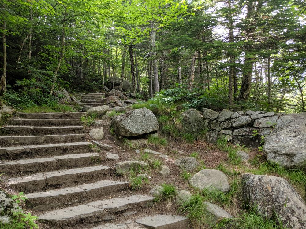 From the parking area, follow the trail signs to an underpass beneath NH-16. On the east side of the road, turn right to follow the Glen Ellis Falls trail. The trail is wide, but there are some places where hikers need to hike over boulders. There has been extensive trailwork on this trail with built stone overlooks with interpretive information over the top, middle and bottom of the falls. About halfway to the bottom of the falls, the trail goes down a series of wide stone steps. Remember, you have to climb back up to return to your car!