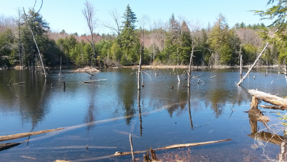 Pond Loop Trail (Blue Blazes): These trails meander around a cluster of beaver ponds near the parking area. The shortest loop is an easy 1.6 mile, 45 minute walk. The longer loop, which includes scenic views of the Eames Ponds, takes 1 hour and has an additional 60 feet of elevation gain/loss.