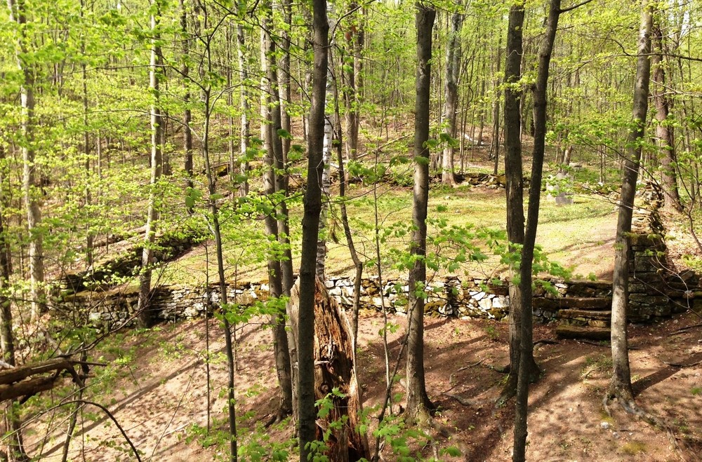 The trails form a series of interconnected loops marked with white and blue blazes. Points of interest include the June-Ambler Cemetery and numerous old stone walls and cellar holes which mark the homesteads of the first settlers of Brandon, in what was then known as Neshobe.