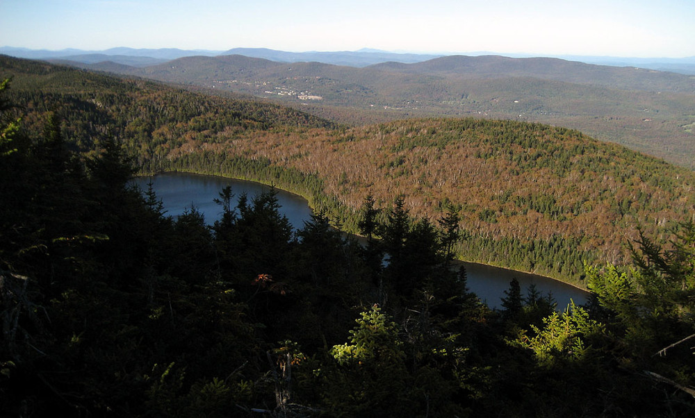 The small rocky peak looks to the east, over the Deerfield Valley of Wilmington and Dover, with New Hampshire's distinctive Mount Monadnock on the horizon. Below are the waters of Haystack Pond, while to the left is Mount Snow. An informal path to the right, which crosses a small cleft in the rock, leads to a south-facing overlook of Harriman Reservoir, the windmills in Searsburg, and the highest peak in Massachusetts, Mount Greylock.
