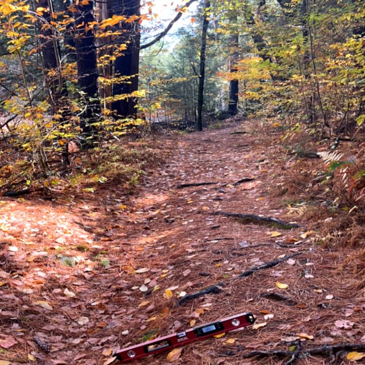The Beaver Pond Trail is a relatively flat out and back trail. There are many large (>2” surface disruption) roots in the trail treadway. A person with a wheeled rollator or stroller may be able to navigate the trail if it can be lifted up and over large roots and medium sized downed trees. There are steep cross slopes in a few short sections along the trail but, generally the slopes and cross slopes are 3-5%