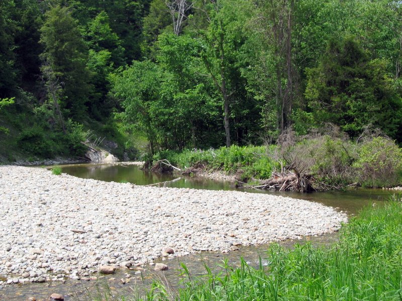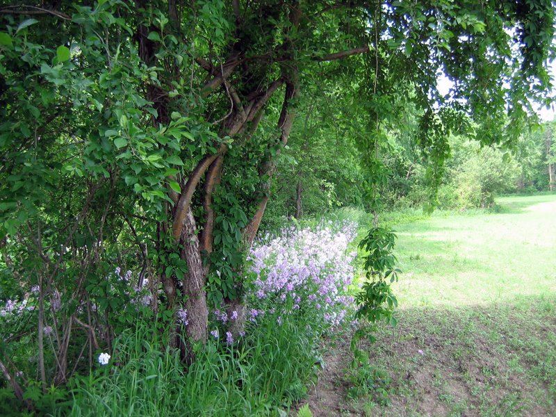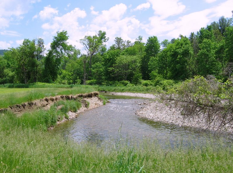 At the far end of the second field there is a steep, narrow, short little drop into a wooded path along Brushy Brook, a feeder stream into the Huntington River. Bear to the right to follow the path to the end. The path ends up a bank onto the Main Road. You can take the road back to the right and make a loop, but there are no sidewalks and very little shoulder on the road, so it’s much nicer to just turn around and take the path back. If you take a left onto Main Road, it’s a quick detour to the Jubilee Farm’s Organic Vegetable Stand in the big white barn (you can’t miss seeing it from the end of the trail).