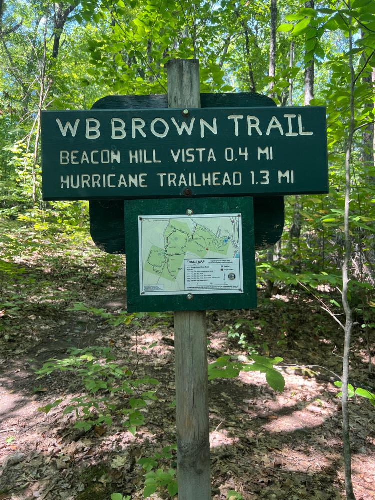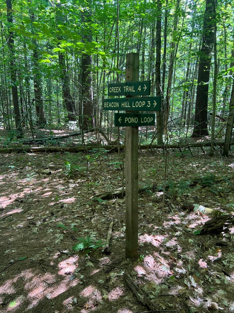 I hiked around the outside, Pond Loop to Creek Trail to Beacon Hill, to Monument, and back to Pond Loop. Probably about two miles. The VAST trail intersection was a little confusing. The big black arrows on a yellow diamond signs are the VAST trail, so don't follow them. Most other intersections were well marked, except the T intersection at the northmost part of Beacon Loop. Why that one is the only one without a marker, I'm not sure. Pond Loop is fairly easy, but short. Beacon Hill is definitely moderate.