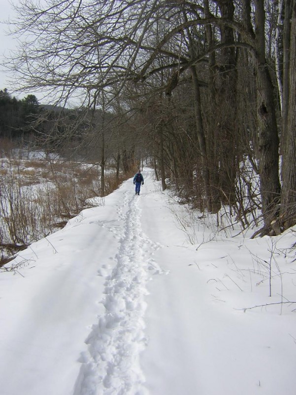 Richmond Trails CommitteeThis trail is a link in the Cross Vermont Trail from Richmond to Williston and does not have distinct endpoints where you could park a car. (See note on parking below.) At the northwest, it links with the town-maintained (unpaved) part of Johnnie Brook Road - a sharp turn south beside the Winooski River just west of where Route 2 crosses the Winooski River. After 1.2 miles, Johnnie Brook Road turns into a driveway. Where the driveway takes a sharp right ('trailhead'), continue straight, downhill, on the old town road. At the south-east the Trail starts on Huntington Road about 0.6 miles west of the Richmond Round Church ('trailhead').