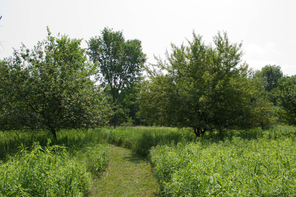 The Woods Trail begins at the footbridge at the north end of the day-use parking area. From there the trail winds its way through a meadow with islands of trees, apple trees and opportunities for birding. The trail is on flat terrain and winds its way back toward the park entrance road. The Meadow Trail intersects the Woods Trail near its eastern end. This trail climbs a short distance and follows a ridge through the forest before descending back to the meadow, where it follows a mowed path. The bridge has steps on one side.