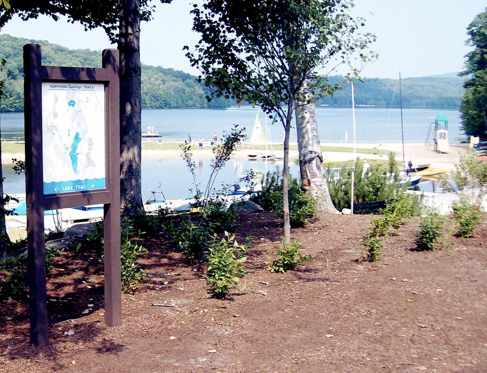 Between East Cove and South Cove the trail passes under stands of eastern hemlock that provide sheltered habitat for a variety of small wildlife. At South Cove, the Activities Center offers extensive facilities, including refreshments at Peppermint Patty’s in the summertime, Memorial Day thru Labor Day.