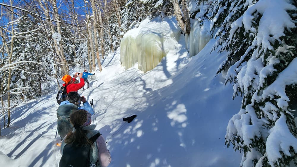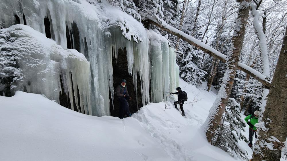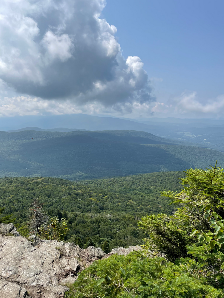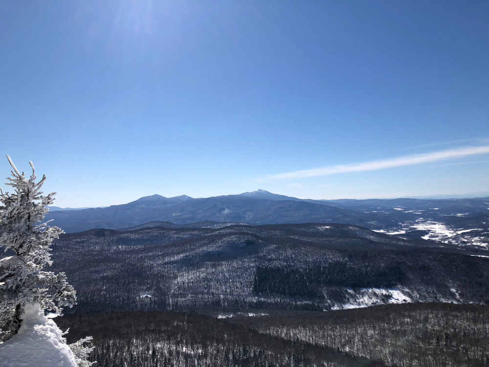 From the Codding Hollow Trailhead, the Long Trail heads north on an old logging road before veering upward on a narrower path. After just under two miles, the trail emerges on to the ledges of Laraway Lookout. The lookout provides outstanding views to the west and south. In winter, water flowing down the cliffs creates interesting ice formations. The treed summit is 0.4 miles past the lookout.