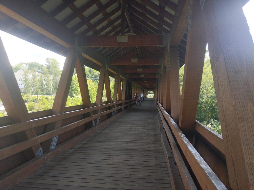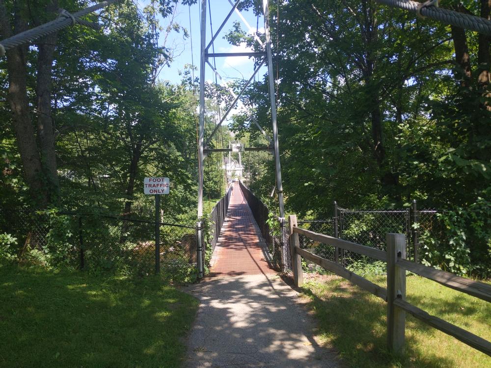 The Littleton Riverwalk connects two interested bridges over the Ammonoosuc River to make a loop near downtown Littleton. The trail starts on the south side of the river as a 4+ foot wide compacted gravel pathway. It passes a bench and community art spaces as it follows the river. After about a third of a mile, the trail either branches to the left to meet Riverside Drive or turns right to cross the Curran Suspension Bridge. The suspension bridge may be difficult for some strollers and wheelchairs. On the north side of the river, the path joins a paved walkway along Saranac Street. Turn right to follow the pathway and then sidewalks to either access the shops on Main Street or continue along Ammonoosuc and Mill Streets. Stop by and make some music on the instruments at the park along the way! Cross the pedestrian covered bridge to return to the parking areas.