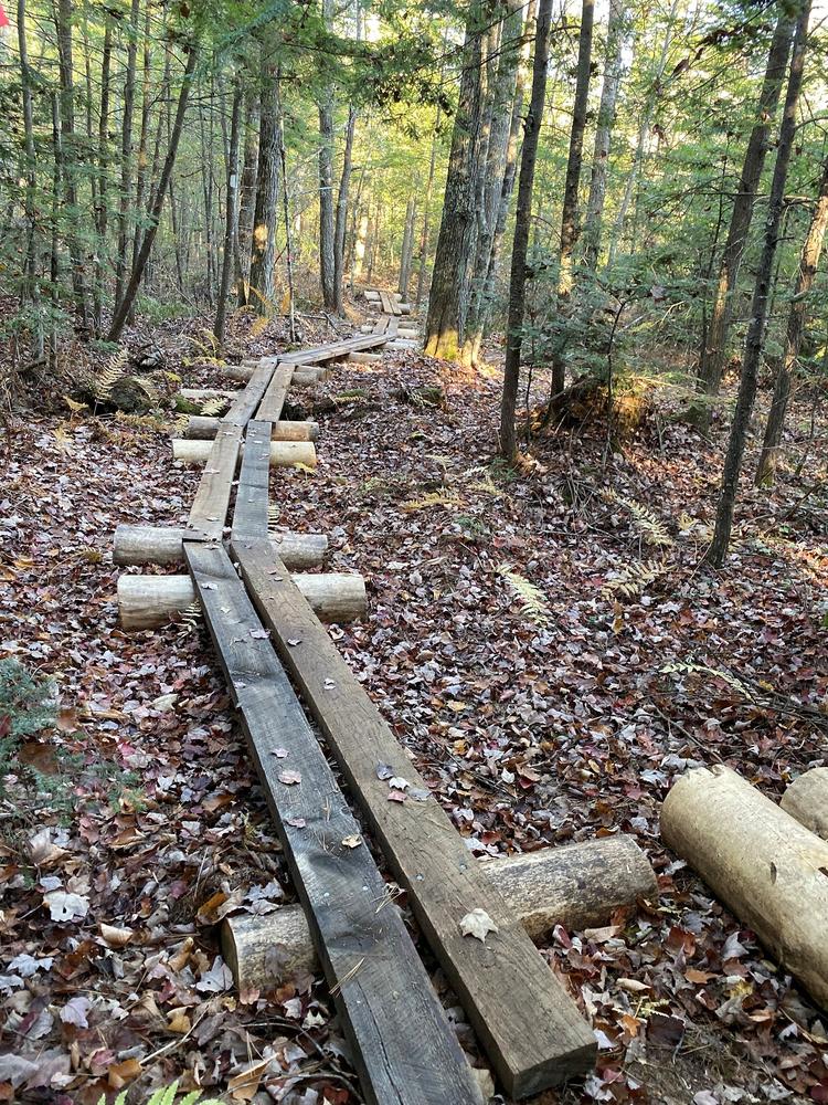 The 2.1 mile Lovejoy trail network in Loudon NH features a boardwalk over wetlands, a historic rangeway, stone walls, and woodlands.