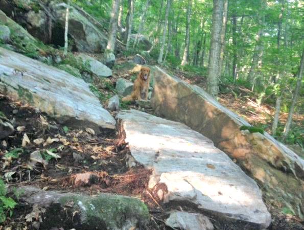 After leaving the Tote Road, this orange-blazed trail crosses several gullies and a brook before arriving at the Four Corners, where it meets up with the Two Brooks Trail. To the left (east) the trail continues on the out-and-back White Ledge Trail, heading sharply uphill on the way out. After 0.2 miles, the confluence of two brooks provides a pleasant view.The trail then meanders until it reaches the White Ledges at the AT corridor boundary. Near this eastern boundary are the dramatic slabs of white stone that gave name to the trail. This outcropping of erosion-resistant quartzite forms the spine of Moose Mountain.