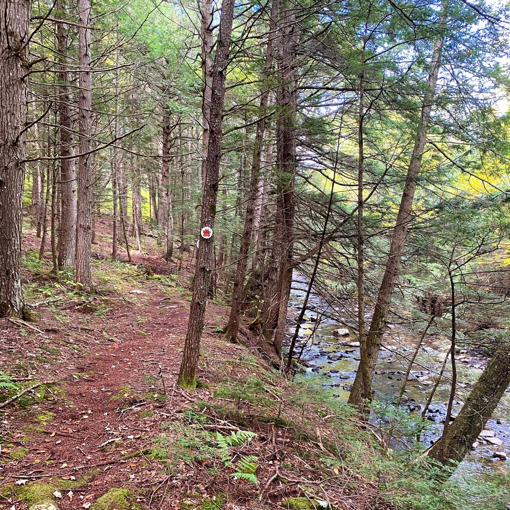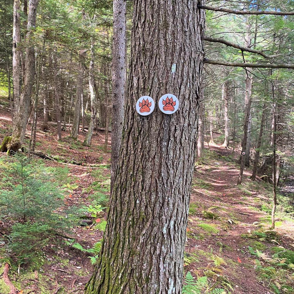 The trail follows Cook Brook along the hillside, for a 0.2-mile loop with 70 feet of elevation change. It is marked by by paw print blazes. Where there are two paw print markers on one tree, the trail splits into the loop. Heading straight ahead and following the brook, the trail ascends the hillside with a couple of small switchbacks. It then almost immediately begins its decent back down the hill, encountering a few switchbacks toward the pond.