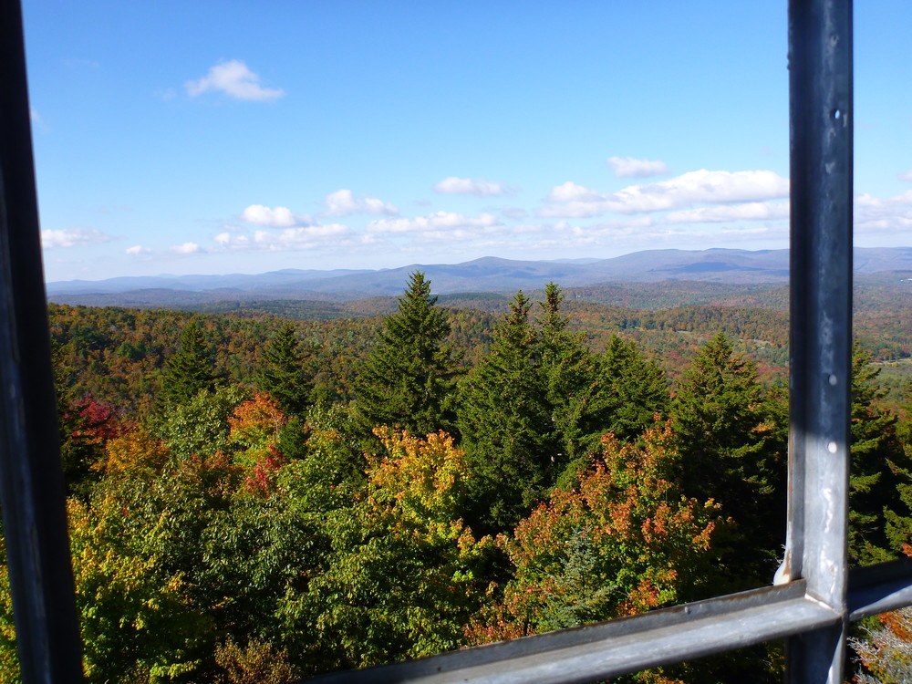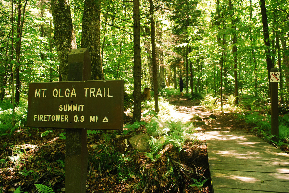 This moderate trail starts across from the park office and rangers’ quarters. The trail crosses a small brook over a bridge, crosses through a stone wall and then ascends gradually with several switchbacks through northern hardwoods, and spruce and fir woodlands. At 0.4 miles the trail crosses through a second stone wall - the stone walls are evidence of the land’s agricultural past. The trail then begins a steady climb towards the summit. Near the 0.7 mile mark, a short spur trail leads to the Summit of Mt. Olga, elevation 2,415 feet, and to the Mt. Olga lookout tower. This former fire watchmen’s lookout is kept open for recreational viewing of the expansive 360 degree views of the southern Vermont Green Mountains, the Berkshires to the south in Massachusetts, and Mount Monadnock to the east in New Hampshire. The Searsburg wind farm is visible to the west, and Mount Snow can be seen to the northwest. A kiosk with a trail map is also located on the summit.