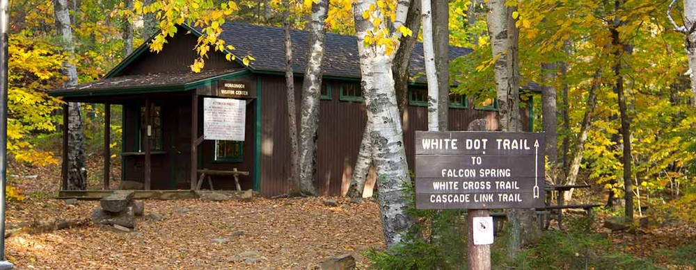 Cascade Link (from Park Headquarters, White Dot Trail): This 1.3 mile long trail traverses the east side of the mountain, connecting the Pumpelly Trail and the White Dot Trail, junctioning with the Harling Trail, Birchtoft Trail, Red Spot Trail, and Spellman Trail. Blazed in yellow circles, this link can be used in conjunction with the major trails to make longer loop hikes to/from the summit. Leaving the White Dot Trail adjacent from Falcon Spring, the path winds through some spruce, passing the Harling Trail at 0.1 miles, then winding through a birch forest. It then begins a gradual ascent, paralleling and crossing through the Ark Brook. About a half mile from the White Dot, the Cascade Link passes the Birchtoft Trail, then curves past the Red Spot Trail junction. Shortly after, the Spellman Trail junction can be found (0.2 miles). The remaining 0.7 miles of trail is a gradually ascending route, featuring some select easterly views and passing Eveleth Brook. The Cascade Link ends at the Pumpelly Trail, 1.4 miles below the summit.