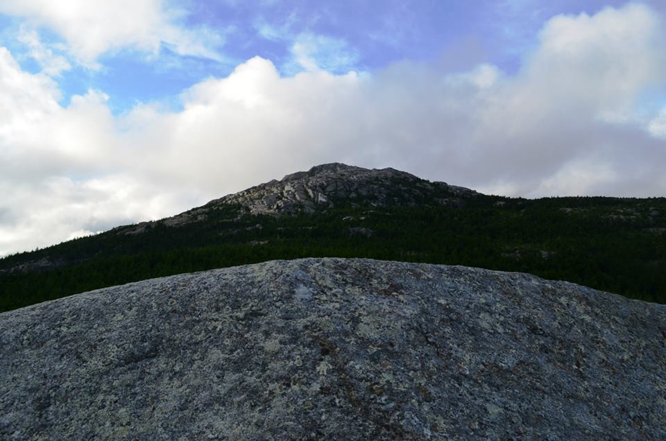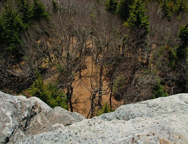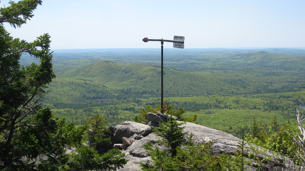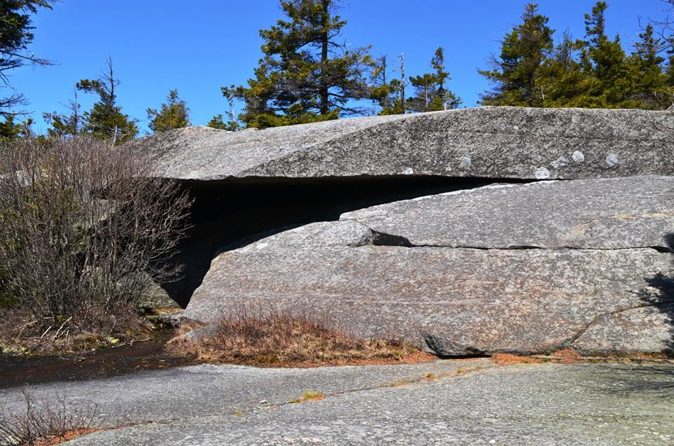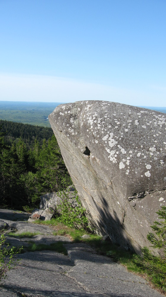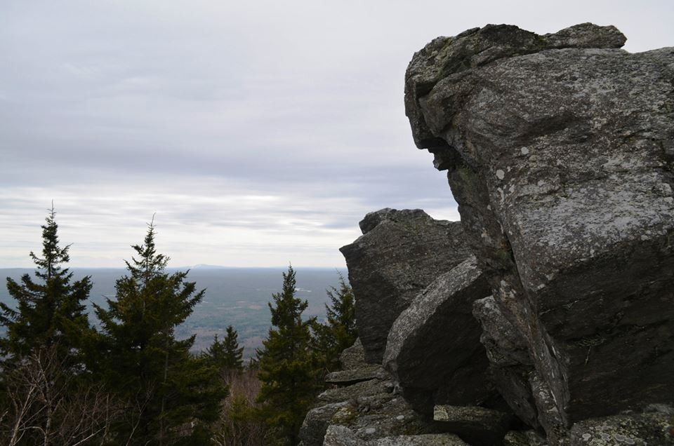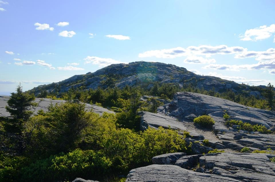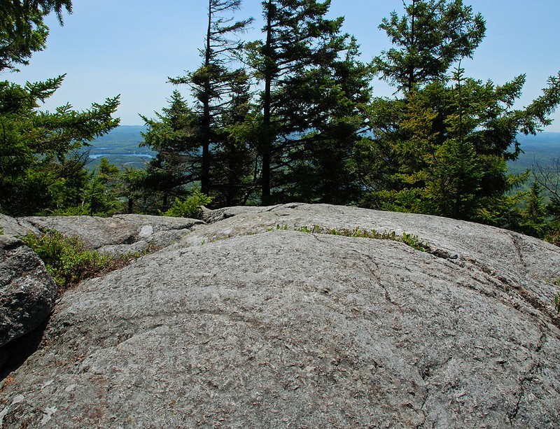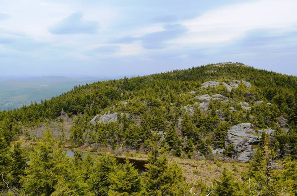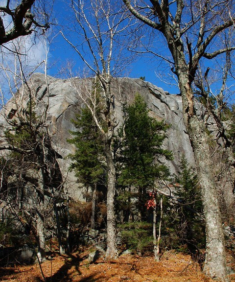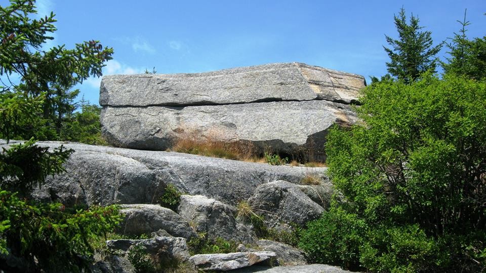 Lost Farm Trail (from Park Headquarters, Parker Trail): This trail is easy to follow and is a longer route to the summit via Bald Rock. The Lost Farm Trail leads north uphill from the Parker Trail 0.6 miles from the Headquarters. The 1.1 mile path, blazed in white rectangles, heads up on moderate grades through a hardwood and then a spruce forest. Shortly before reaching the Cliff Walk, there is a fine viewpoint from open ledge that resembles a slide. The Cliff Walk leads to Bald Rock, from which there are a few options to summit.