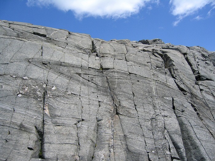 Smith Summit Trail (from Old Toll Road network): Ascending to the main summit from Monte Rosa, this lightly used trail provides excellent viewpoints and is relatively steep in some sections. The trail first descends to the Tooth and then connects with Smith Bypass on the right. From here, the trail continues to the left and meets Amphitheatre Trail at a junction at 0.3 mi. After leading through some spruce woods, at 0.4 miles the trail makes a steep ascent up ledges where at the top are nice views of the west and south. After turning right at 0.6 mi., the trail leads to a narrow gully that then intersects below the summit with Dublin Trail and White Arrow Trail. The distance from Monte Rosa summit to Mount Monadnock summit is 0.7 mi. and takes about 40 minutes. The geological feature "Billings Fold" is easily viewable from the Smith Summit Trail, just a short distance from the summit.
