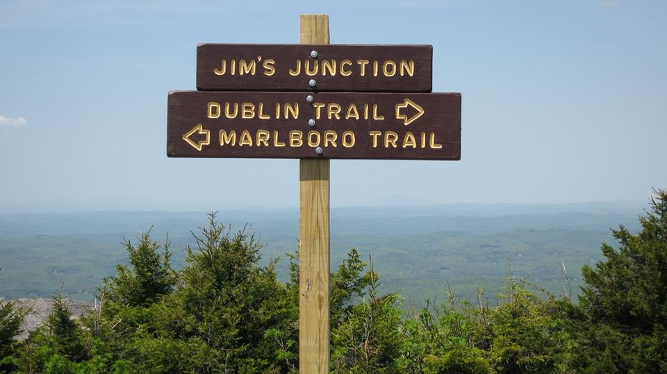 Marlboro Trail (Access on Shaker Farm Road is not recommended for low to mid level clearance vehicles. It is not maintained in the winter.): (2.1 mi, 3-4 hours roundtrip) The Marlboro Trail is one of the oldest trails on the mountain; although the route became lost in the 1920s, the route re-opened up a slightly different course soon after its re-discovery. The steepest of the main trails to the summit and blazed with painted M's, it begins at easy grades through a forest maturing from pasture and then heads up on moderate to steep grades, passing open ledges with views, and continuing easterly up the mountain through spruce before ascending on ledges with views. The trail gets steep before cresting a bare ridge where the grade eases with 180º views and then joins the Dublin trail for 0.2 miles to reach the summit. Hikers descending from the summit should look for the painted "D/M" markings. The Marlboro Trail splits from the Dublin Trail at the signed "Jim's Junction".