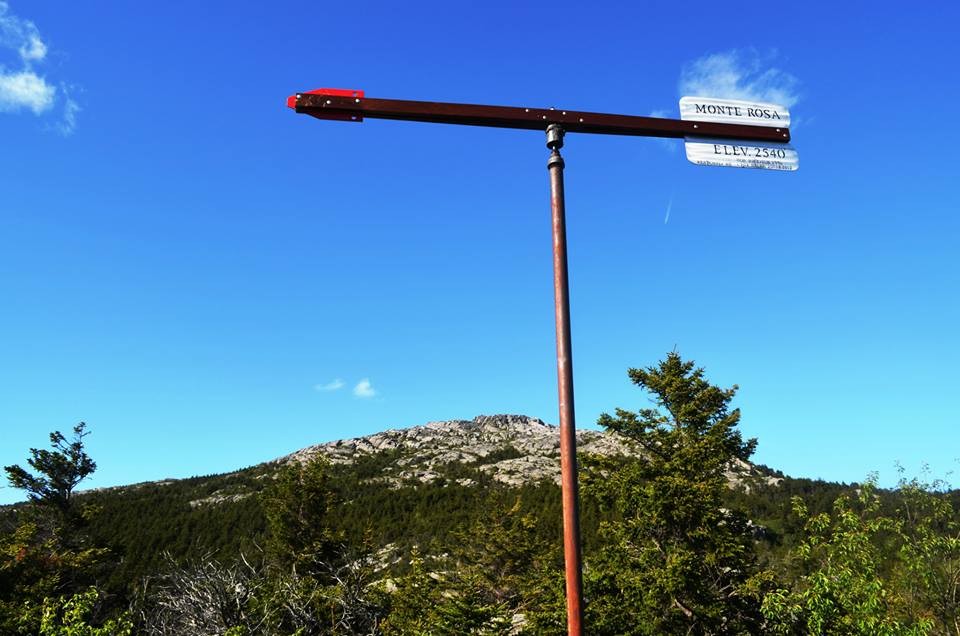 Monte Rosa Trail: (from Old Toll Road network): North of the Halfway House clearing, is where the Monte Rosa trail departs from the west side of White Arrow Trail. 50 yards from this junction is where signage is located for Fairy Spring and Monte Rosa Trails. Afterwards, entering from NH 124 is Royce Trail. After Monte Rosa trail crosses Fassett Brook via Bridge and follows along for 35 yards, Fairy Spring Trail diverges to the right and then after 0.3 mi, Fairy Spring Trail joins Monte Rosa again at a junction, after a steady climb. Monte Rosa follows to the left after the junction and continues a 400 foot and 0.4 mile ascent to the top of Monte Rosa, which features an historic weathervane. From this point, descending to the northeast is the Smith Summit Trail (to the summit) and descending west is Great Pasture Trail.