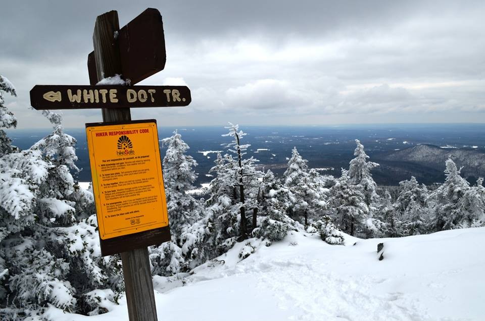 White Dot Trail (from Park Headquarters): (1.9 mi, 3-4 hours roundtrip) This is shortest, most direct route to the summit. The trail is steep and rugged, particularly in its middle section and final approaches to the summit. It is by far the most used trail on the mountain and on a busy day you will have company heading up the mountain. This trail passes through mixed forest, over steep and exposed ledge, and features many viewpoints. Hikers often use the neighboring White Cross Trail for descent back to State Park Headquarters.