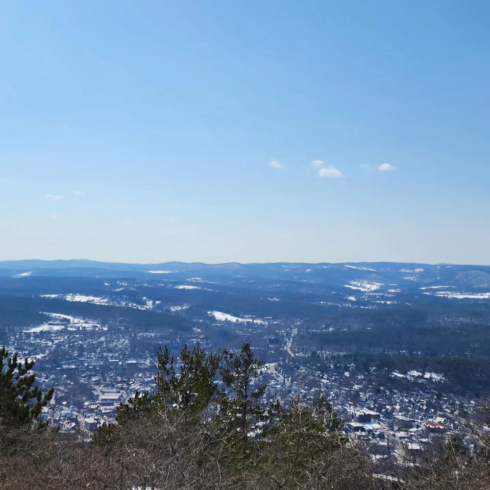 The Wantastiquet Mountain Trail begins between the two granite posts near the parking on the right side of Mountain Road. For most of its extent, the trail follows an old gravel road with many switchbacks. Side trails access a small waterfall near the trailhead and several viewpoints mid-mountain. After ascending 1,100 feet over 2 miles, the trail passes a rock outcrop with excellent views across the Connecticut River Valley. In another 0.1 miles, the trail passes near the true summit of Mount Wantastiquet at a clearing for the communication tower. Continuing east, hikers may access Mine Ledge Trail and then Ann Stokes Loop on the backside of Wantastiquet (not shown on map). A side trail descends due south along a gulch emerging onto NH-119 0.8-miles from the trailhead on Mountain Road.