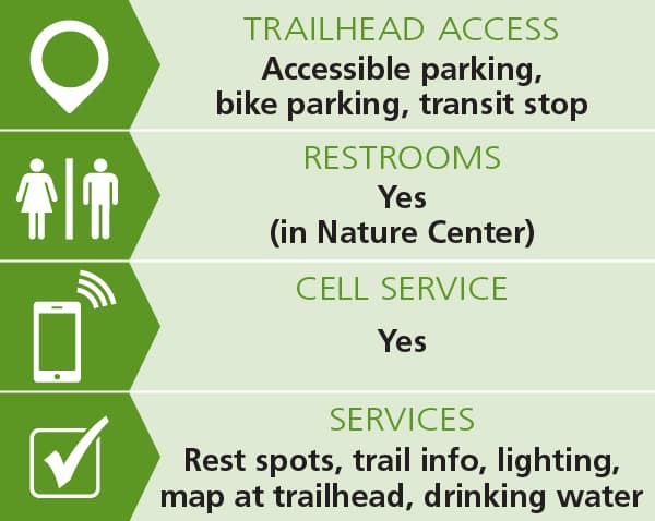 There is a 0.3 mile Universal Access Trail loop that starts and ends at the nature center parking lot. The 4-5 foot wide flat compacted stonedust trail makes a loop around the community gardens. Benches are located throughout the trails. Conditions are variable in winter. See Trail Access Information below for more information about this Accessible Experience.