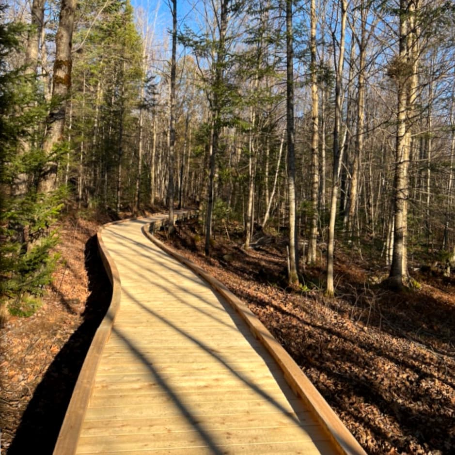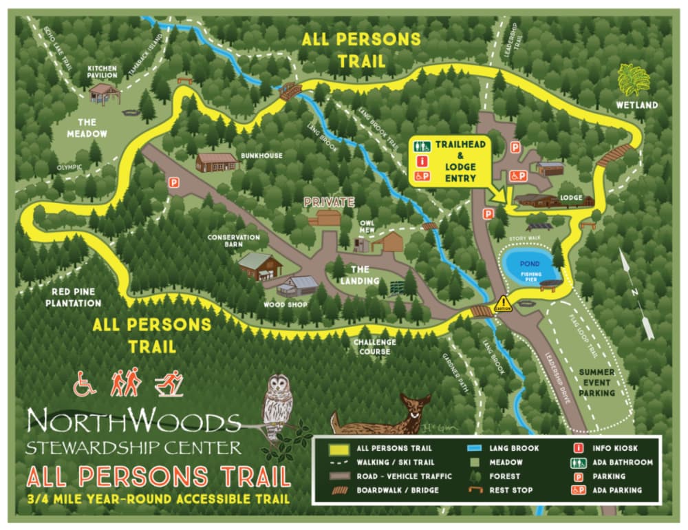The All Persons Trail (0.8 miles) provides a winding tour of the northern hardwood forest as it encircles campus, over rolling terrain. The trail is ADA-compliant and designed to welcome everyone—specifically those who use wheelchairs, adaptive equipment, mobility aids, and small children in strollers or on balance bikes. Features include an accessible fishing pier at the NorthWoods Pond, a bridge crossing of Lang Brook, and a wetland boardwalk. See Trail Access Information below for more information about this Accessible Experience, or visit the NorthWoods Stewardship Center's All Persons Trail page for additional descriptive details. Take a ride on the All Person's Trail with John Guttermen in his video of the trail.
