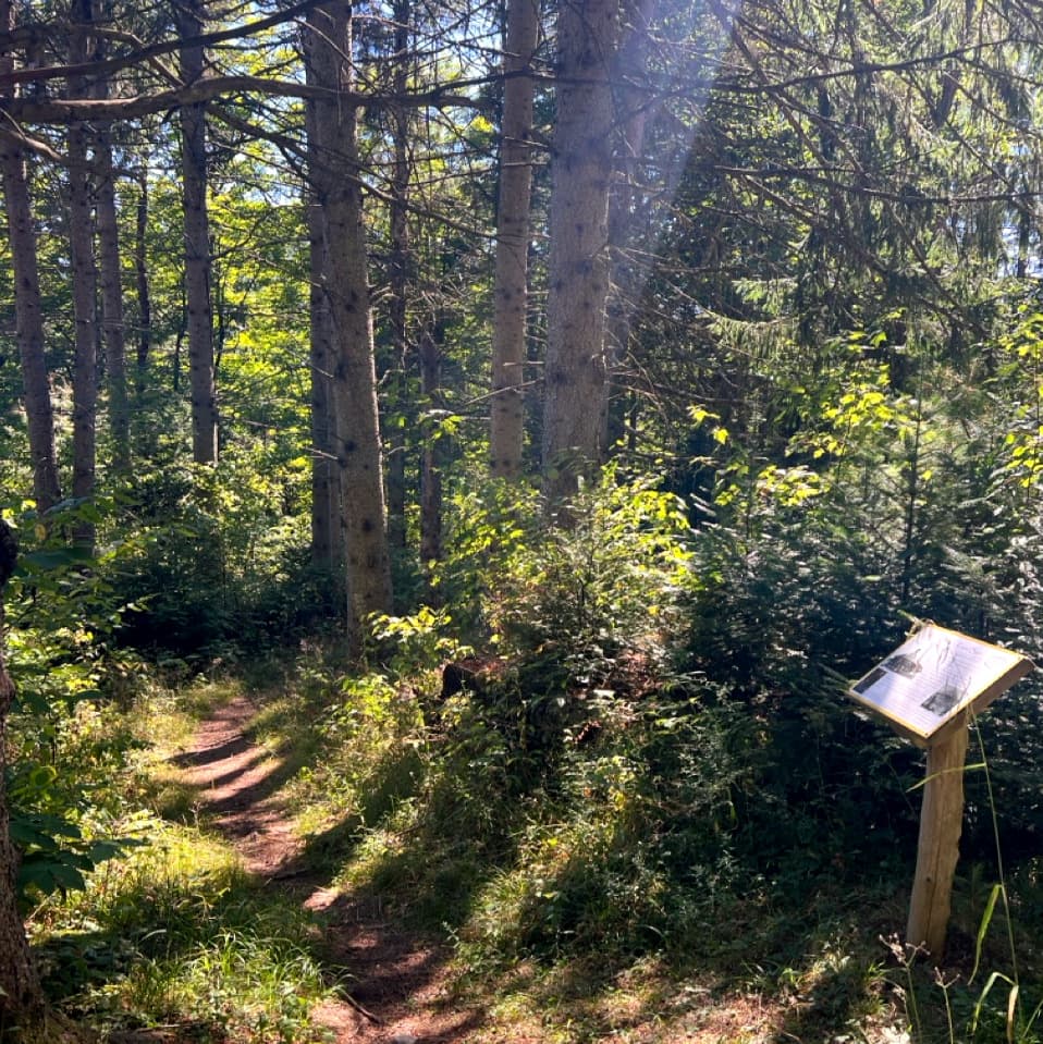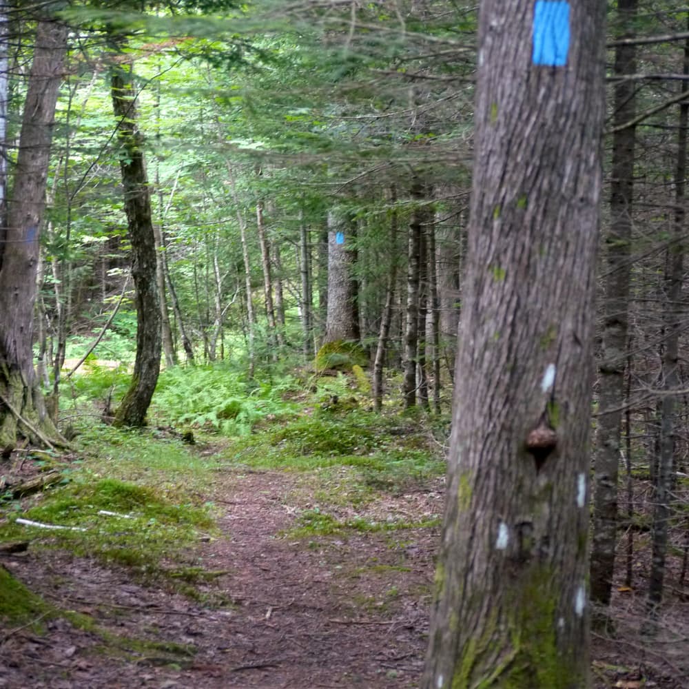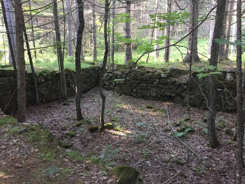 The Gardner Path (0.7 miles) is an interpretive loop that traces the historical signs of human habitation on the NorthWoods land. From the trail head junction with the All Persons Trail, yellow blazes lead visitors through a pine plantation and past the Lang family homestead and round barn foundation (circa 1908), with nine interpretive signposts providing information about the human and ecological history of the property, from the stone farm foundations, to wildlife habitat, and the importance of the nearby Clyde River as transportation for the Abenaki, the first people of the region. The trail follows signs of past and current land use and loops back to join the All Persons Trail. Visitors can turn right to continue following interpretive signposts along the accessible trail and back to the Gardner Path trail head.