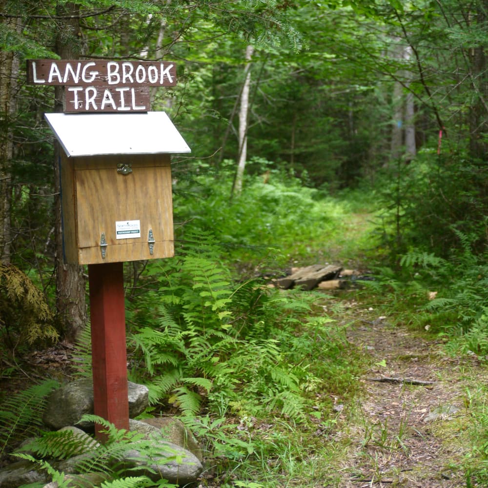The Lang Brook Trail (0.5 miles) is an interpretive trail which follows Lang Brook upstream for much of its length to a small beaver pond. Eight signposts along the blue-blazed trail offer views of distinctive habitats and native species, including topics like species succession, glacial geology, and wildlife habitat. Continuing to follow blue blazes through junctions with the All Persons Trail and winter ski trails, visitors reach the beaver pond, where they can either return the way they came or keep left to loop around and follow the Echo Lake Trail east back towards campus. (Use caution when crossing over this trail's bog bridging which can be slick when wet.)