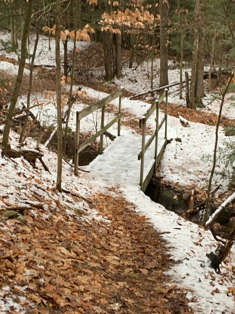 Lush ferns edge an overflow area on your right and bunchberry plants on the ground lead you to a wooden bridge. Notice the snag full of holes made by pileated woodpeckers looking for insects.  The holes shelter small birds and animals.  A picnic lunch can be enjoyed at the tables.