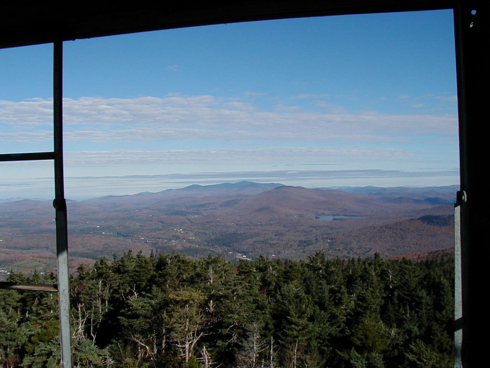 The blue-blazed trail starts out on an old logging road that crosses a small bridge and follows along the railroad tracks a short distance. It then turns right, away from the tracks. It crosses a second bridge (0.2 mi) and parallels a brook before crossing it on a third bridge (0.7 mi). The trail climbs steadily on switchbacks to a plateau (1.5 mi) where the trail flattens out and follows the mountain contour. The trail then crosses a stony brook bed (2.0 mi) and climbs to an overlook (2.3 mi) with views to the north (Salt Ash Mountain, Shrewsbury Peak, Killington Peak, Little Killington Peak, Mendon Peak) and west (Taconic mountain range). Beyond the overlook, the trail climbs steeply upward for about ½ mile. The trail levels, coming to the remains of a forest lookout ranger’s cabin (2.9 mi), and just beyond the cabin, intersects with the trail from the Mountain Road. Turn right at this signed trail intersection and continue to the fire tower (3.0 mi). The trail ends at the fire tower. The view from the tower includes the Okemo Resort ski area on the eastern flank of the mountain; Mount Ascutney to the east; Glebe Mountain, Mount Snow (in the far distance) okemoStratton Mountain, and Bromley Mountain to the south; Dorset Peak and the Taconics to the west; and Killington Peak to the north.