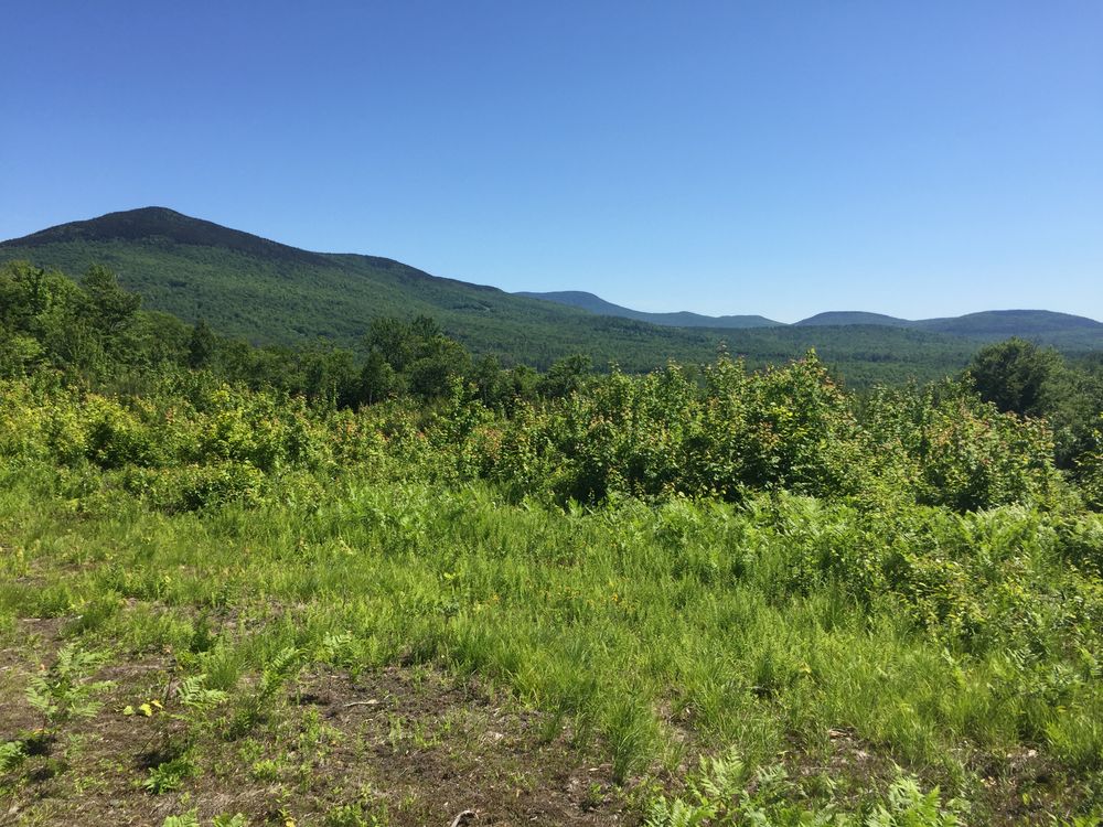 The eastern section of the Heritage Trail from Indian Pond Road follows the original Old Grimes Hill Road. It is a very nice undulating woods road and passes next to vernal pools and other wet areas. Just before the trail enters the woods, there is a clearing that has been used as a log landing (last activity in 2019). Uphill and to the south through this clearing, there is another clearing with an excellent view to the south-southeast of Mt. Cube and Smarts Mountain.