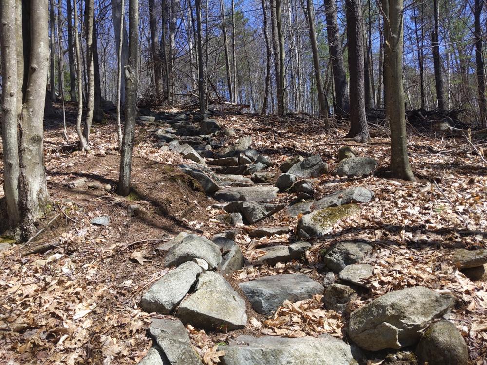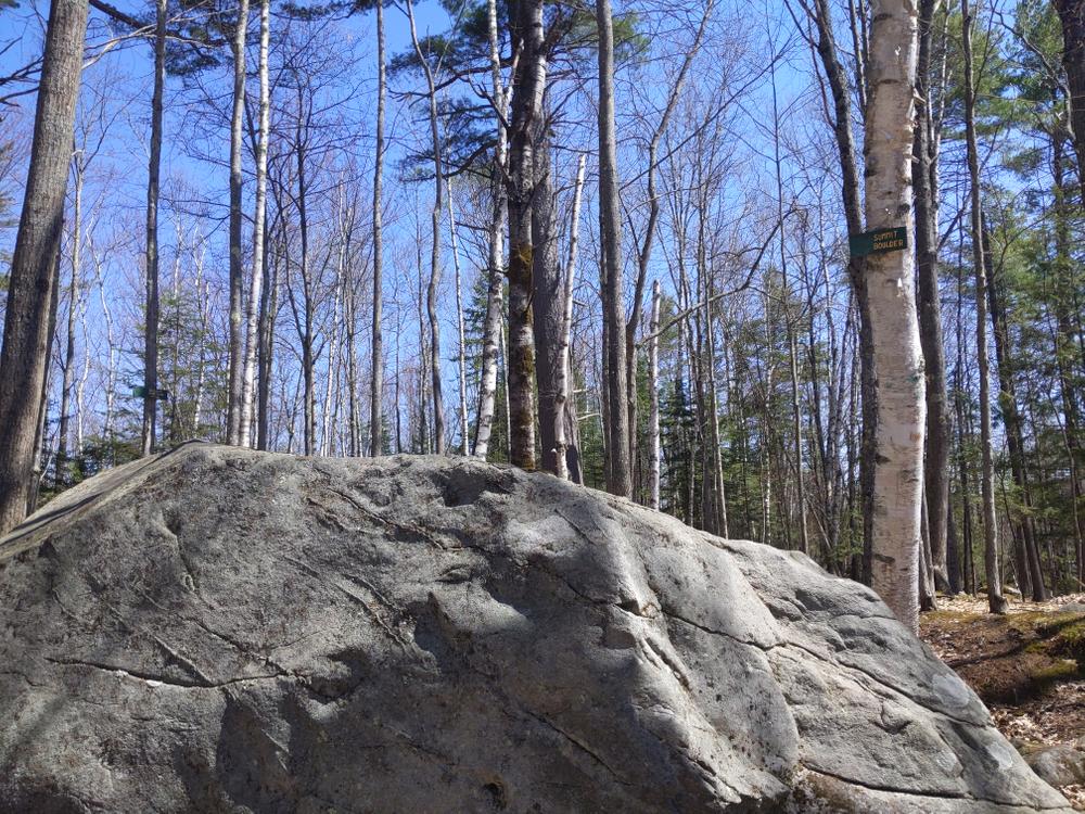 Starting through a stand of tall White Pine trees where 100 years ago was a cleared hillside known as Oak Hill Pasture. The path climbs steeply up a stone staircase built by area students and soon crosses East Street and then the Radio Tower double-track. The trail levels onto the ridge of the hill and passes several huge boulders known as glacial erratics left here over 10,000 years ago by the mile thick ice sheet as it moved south. The hill top is soon reached marked by one of these erratics called "Summit Boulder" then it continues descending past Tea Pot Rock to Boulder junction where it turns sharply left quickly crossing the top of the clearing next to the mountain bike skills park. Traversing the hill, the path soon returns to Pine Hill Road. Turn left at the sign to return to the park.