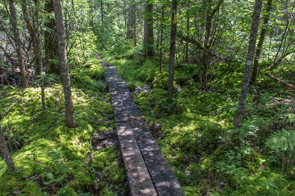 North of Waumbek Junction are the trailheads for the Shore Path, Rampart Path, and Little Cherry Pond Trail. On these trails walkers will encounter exposed rocks and roots, narrow bog bridging, and a couple locations with side slope issues.