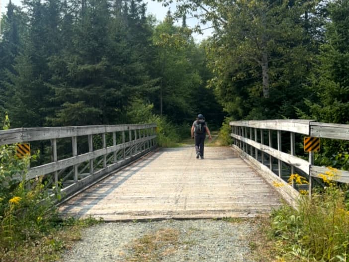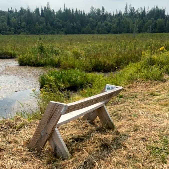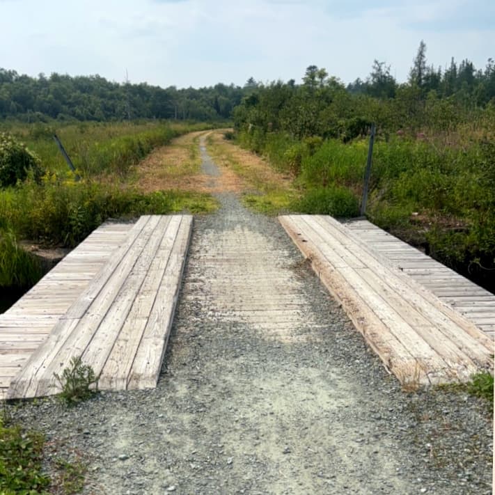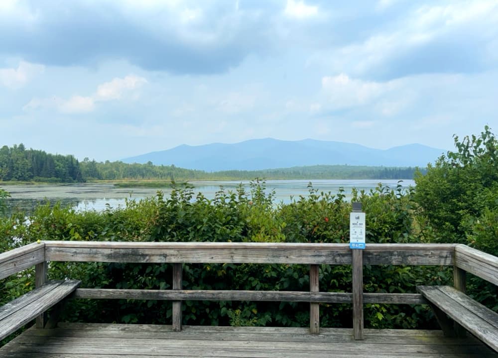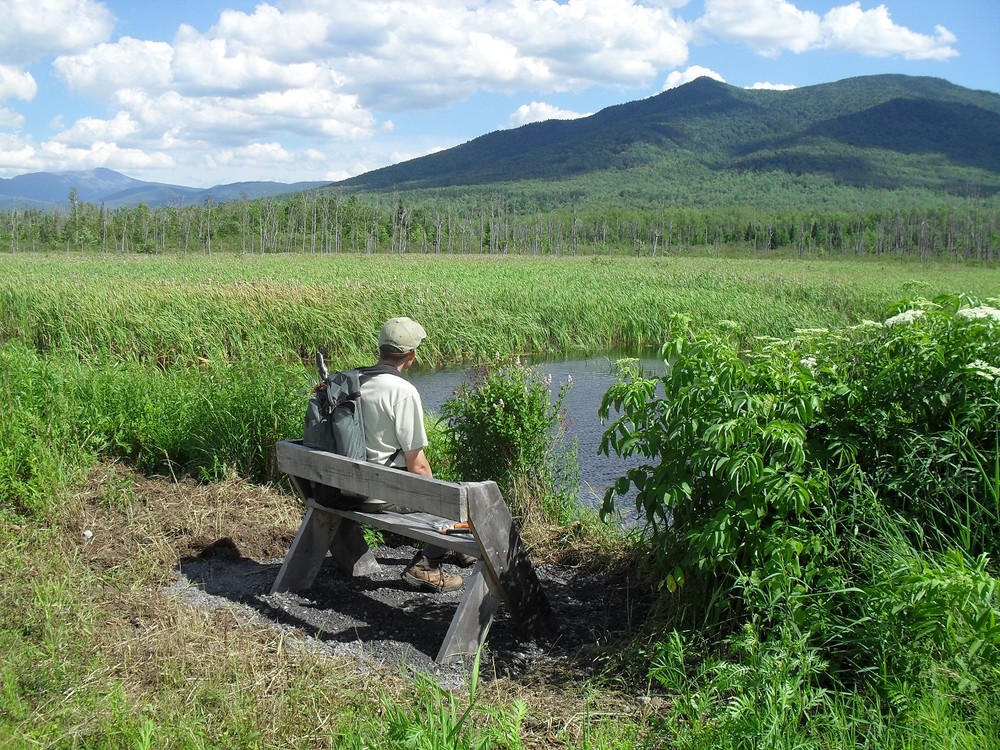As the Presidential Rail Trail heads west from NH-115A, it passes the junction with the Slide Brook Trail and crosses the Giant Trestle bridge over Stanley Slide Brook in 0.7 miles. Continue walking or riding from the bridge through a lovely spruce fir forest and, in 0.9 miles, reach Cedar Marsh and, shortly beyond that, Moorhen Marsh. Both of these marshes have scenic views of the mountains and are excellent areas for birdwatching. From Moorhen Marsh, the trail bends to the northwest and reaches the Tudor Richards Viewing Platform.