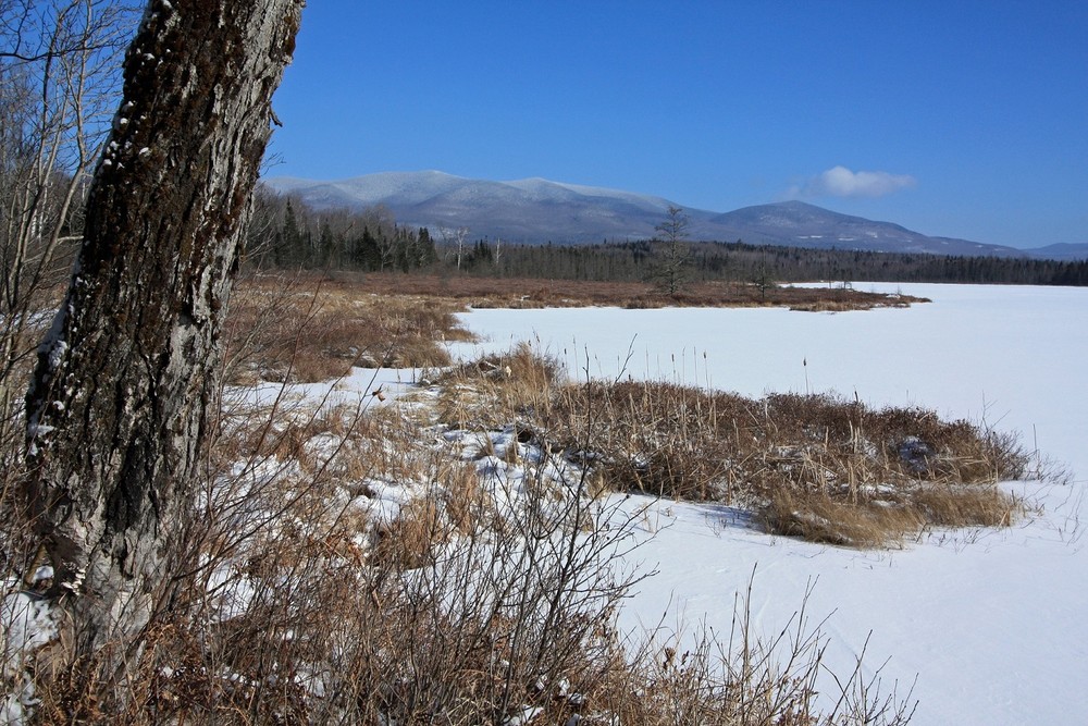 Leaving the trailhead on Whipple Road, the trail heads west and then trends south through a relatively young forest that was logged in 1998. Just over a mile from the trailhead, the trail starts to bend west and soon reaches an extensive area of blowdowns with bog bridges at the edge of a large wetland. The trail then bends south with more bog bridges and soon reaches the junction with the Rampart Path. If you proceed about 100 yards on the Rampart Path, you will reach a bench at the edge of Cherry Pond with an extensive view of the surrounding mountains. In the winter, this bench makes a nice destination for a moderate snowshoe hike.