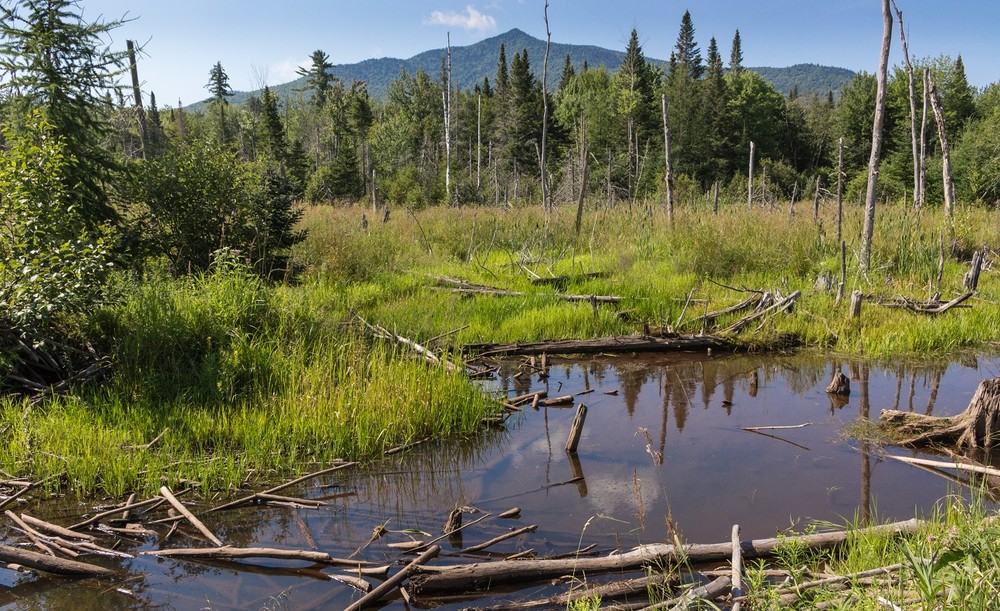 The Slide Brook Trail is just over half a mile in length and leads from NH-115 to the Presidential Rail Trail. It is part of the long-distance Cohos Trail and is blazed in yellow. Leaving the trailhead off NH-115, proceed a short distance to the edge of a large field. This field was the terminus of the famous Cherry Mountain Landslide, which occurred on July 10, 1885 (see the state historical marker in the Owls Head Trail parking lot). Head in a northeasterly direction across the field, following the blazed posts. The trail then enters the woods and soon crosses an old beaver dam from which there are views of Cherry Mountain and Owls Head. The trail then returns to the woods, crosses a powerline corridor, and soon reaches the Presidential Rail Trail. Turn left if you would like to proceed on the rail trail to Moorhen Marsh and Cherry Pond.