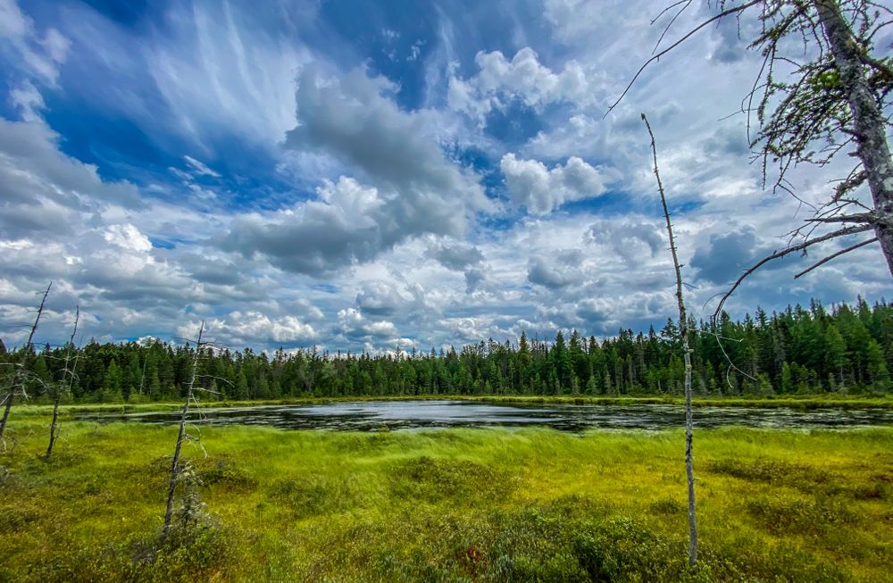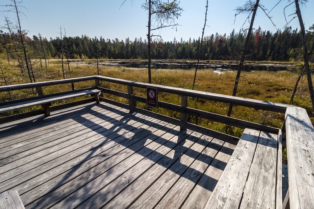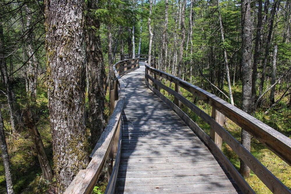 Just over half a mile in length, the Mud Pond Trail (designated a National Recreation Trail in 2013) is suitable for those in wheelchairs and others with mobility challenges, and leads to an observation platform on the shore of Mud Pond. Leaving the parking lot, the trail follows a gravel path and passes the junction with the Mooseway, a winter-only trail, in 0.2 miles. Soon the trail begins to switchback gently down a slope and reaches a 950-foot long, approximately 3.5 foot wide boardwalk. Follow the boardwalk through a lovely black spruce/northern white cedar swamp out to the 8 x 12 foot observation platform that overlooks Mud Pond. Please stay on the boardwalk and use care if the boardwalk is wet. Dogs must be on a leash on this trail.
