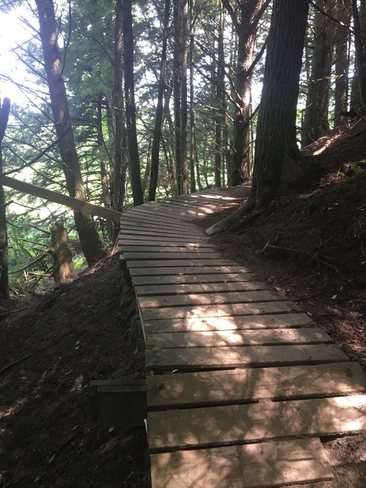 A lower loop that climbs about 300 feet above the Winooski River valley through conserved forested land and an upper loop that climbs to about 1000 feet altitude.