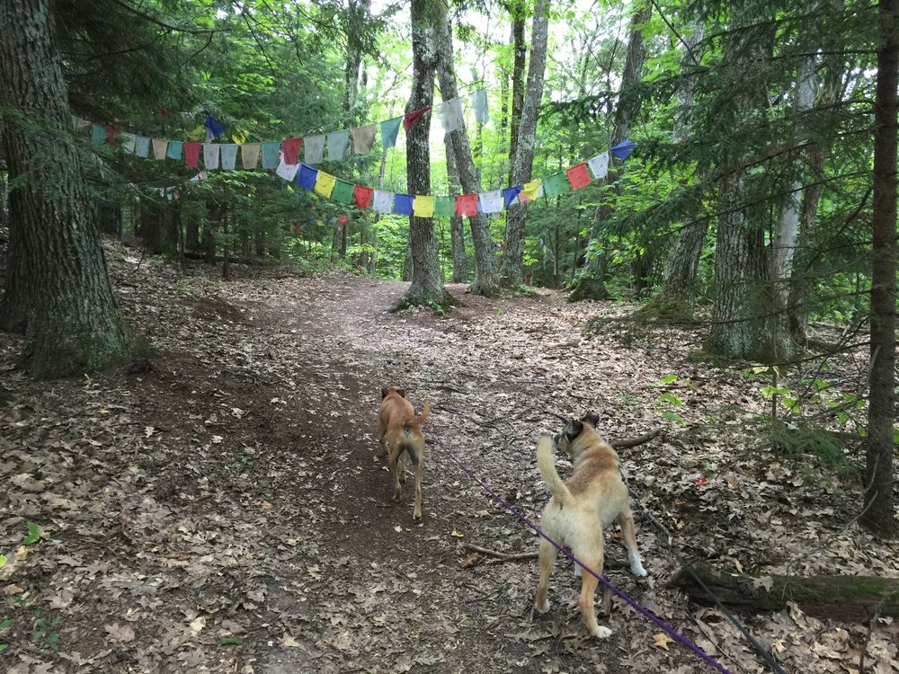 Lung Ta Path (white blazes):  From a high point on the Merritt Parkway above the orchard clearing, this trail follows a ridge to a rocky outcrop facing north across the Winooski Valley.  From there you cross on to adjacent private land (with permission, providing you stay on the trail).  The trail levels out past a series of prayer flags and then switchbacks down with occasional views across to Owl’s Head to join the Preston Loop near the ‘dog’ intersection.