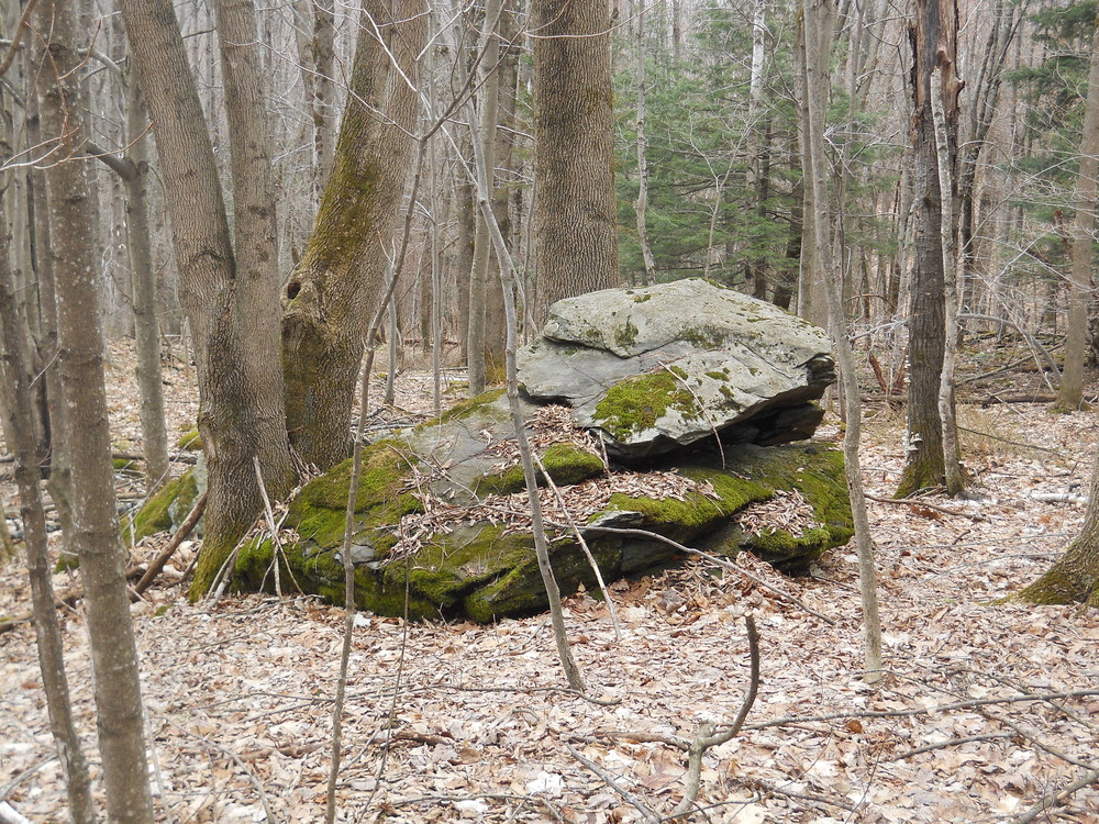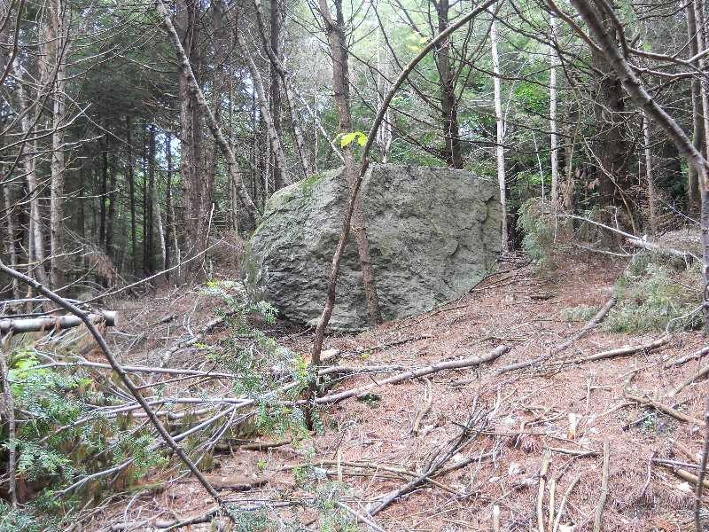 Lower Loop - aka Merritt Parkway (blue blazes): Starting from the trailhead, you climb steadily with numerous switchbacks in a generally southerly direction, reaching an altitude of 500 feet. Then the trail turns eastward and climbs more slowly to a clearing identified by a big rock at about 600 feet. Then you descend on a section again with many switchbacks eventually leaving the Preston Forest Legacy land where the trail becomes a path next to St. Mary's Cemetery for a distance of about 300 feet. Here an adjacent landowner permits only pedestrian use to reach Cochran Road opposite the trailhead for the Rivershore Trail. Go back westward on Cochran Road to complete the loop.