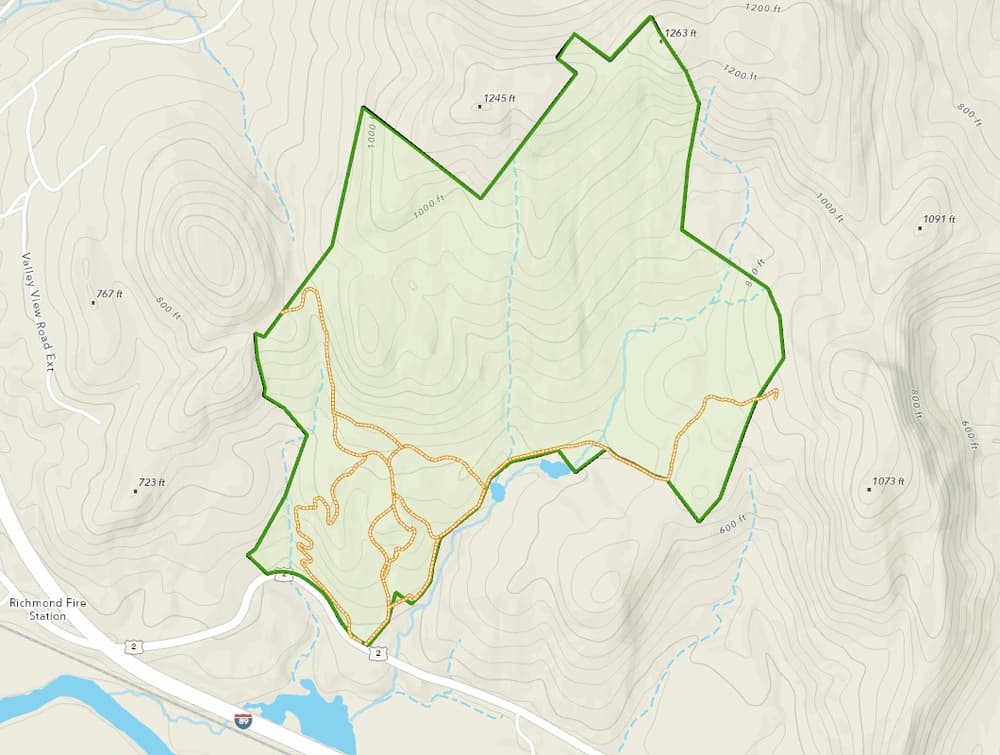 The 2.6-mile trail network consists of an access road and farm road, with trails established on the southern part of the property for non-motorized recreation. Terrain is steep with occasional views across the Winooski Valley.
