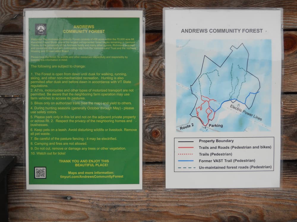 The Andrews Community Forest is a 428-acre, south facing, Town Forest adjacent to US-2, just over one mile east from the village of Richmond. The property rises steeply from an elevation of about 350 feet to a ridge at over 1,000 feet.  It represents a key component of a forest block that protects key ecological resources and wildlife habitat.
