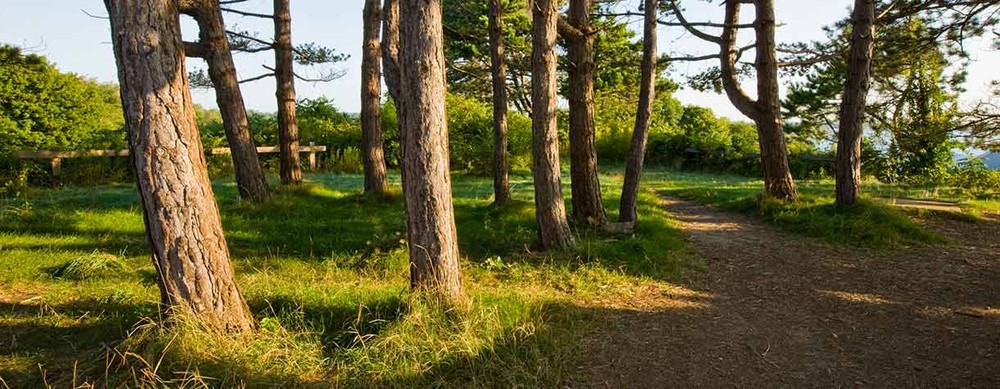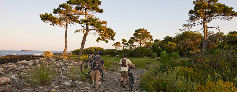 Coastal state park with a dense network of walking and biking trails around old military landmarks.