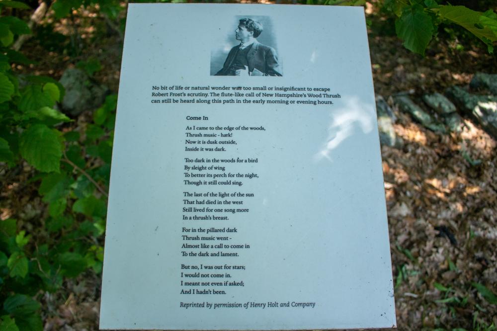 A short nature walk on the grounds of Robert Frost's former residence with signs featuring Robert Frost's poetry along the way.