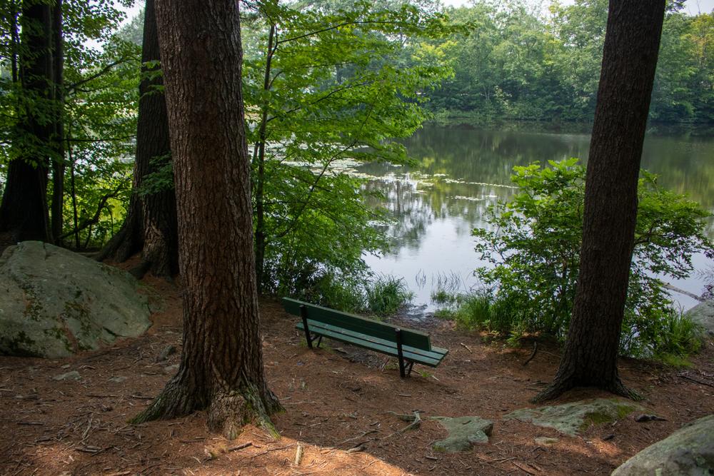 A maze of trails crisscross this forested park which is set back into a west facing hillside with a scenic pond at its base. The park has numerous ledges and massive boulders. A small stream cascades into the pond.