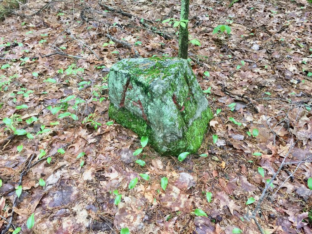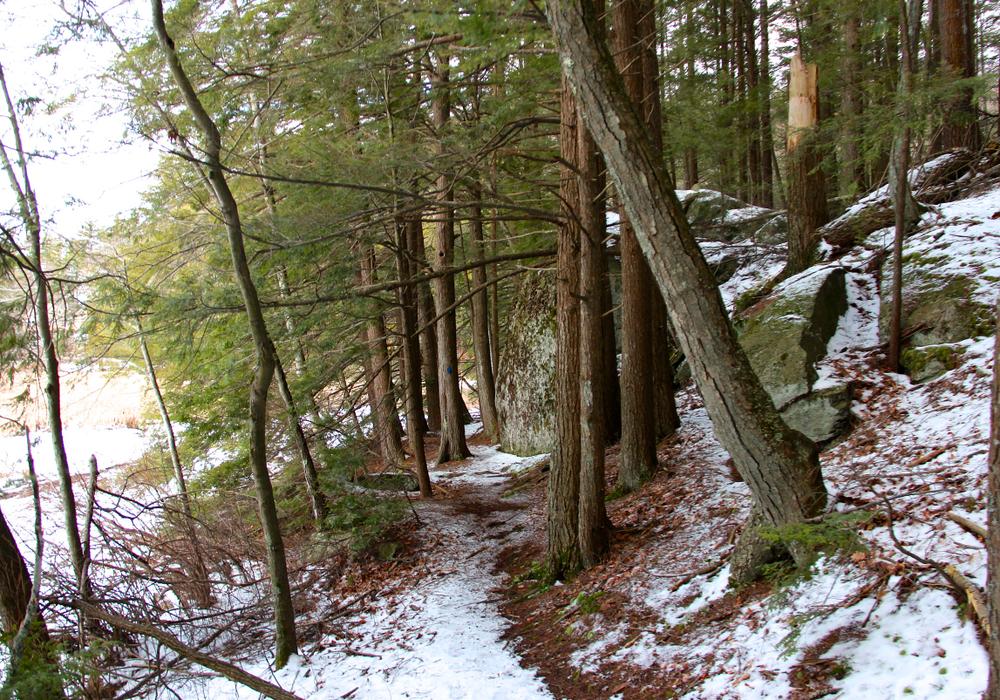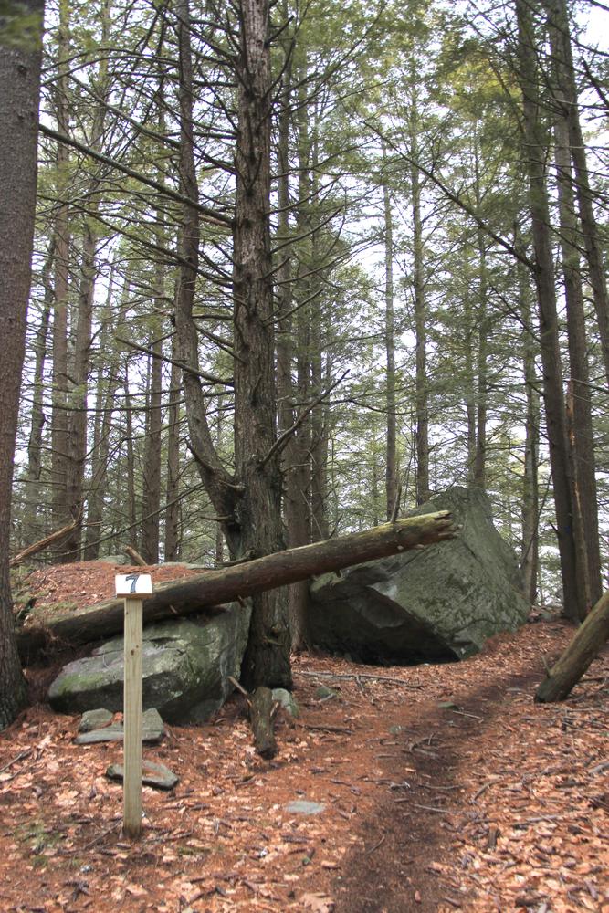 The primary trail loop, blazed in white, follows an Eagle Scout-restored 14 station nature trail with blue blaze trail segments leading to points of interest such as the 1741 Atkinson/Hampstead town boundary marker, the 1847 Luther Chase cellar, and views of Boulder Cove at Big Island Pond. There are several exit trails blazed in red that lead to adjacent roadways and one which provides access to the Hampstead trail system.