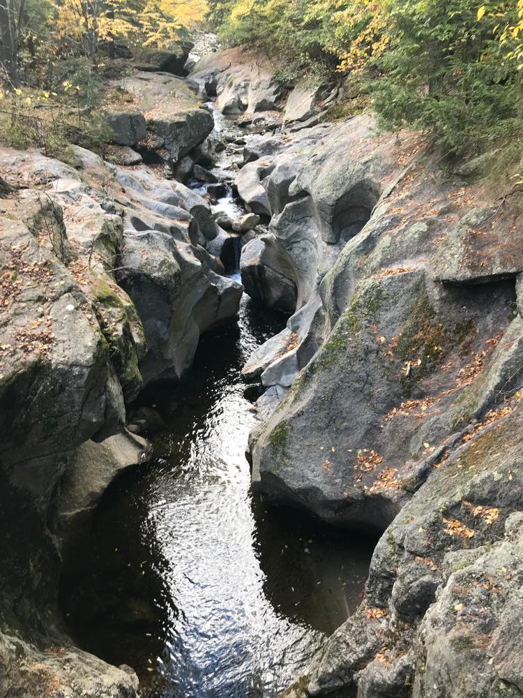 The trail to view the rock formations starts from the parking area. Take care when crossing the road. The bridge over the Cockermouth River is shortly after the road crossing. Farther along the trail, there is a historic cellar hole. The trail continues as a snowmobile trail beyond the cellar hole.