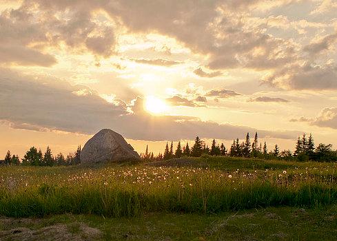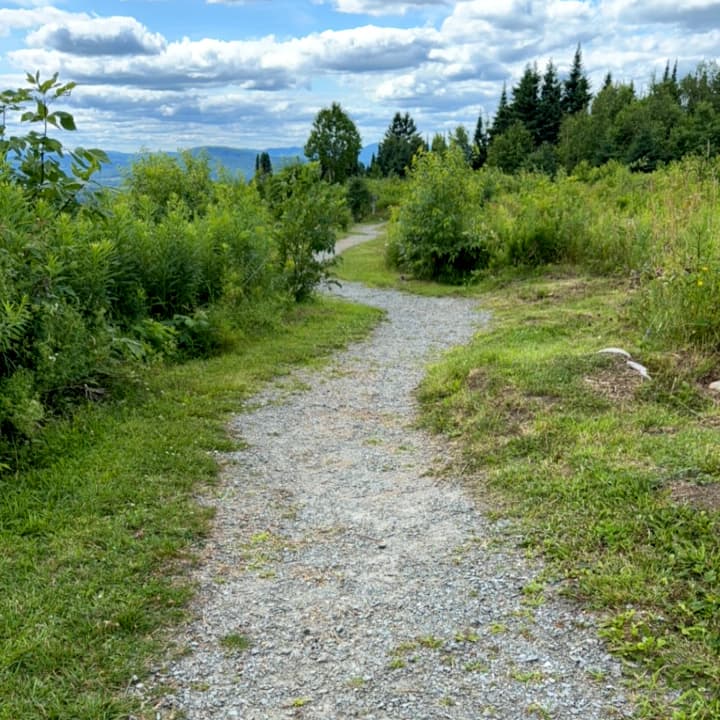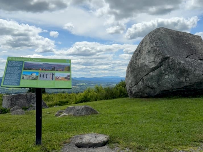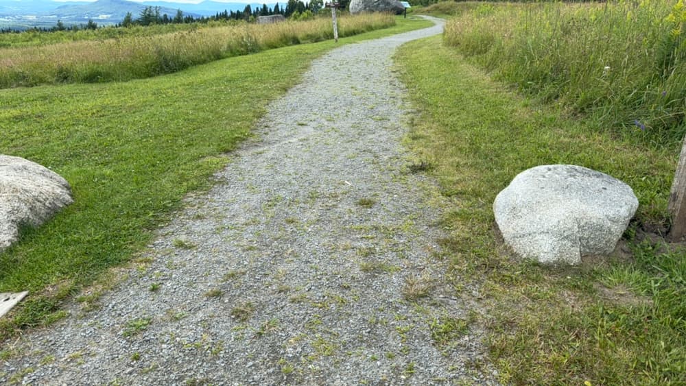From the east parking area, there is a 0.08-mile trail that offers access for many people both to the rock and to great views from the grassy knoll above the rock. The trail is 4+ feet wide with a packed gravel and stonedust surface. Cross slopes are minimal but the running slope is steep in some sections. There is an accessible picnic table at the end of the trail but no rest spots along the way. See Trail Access Information below for more information about this Accessible Experience.